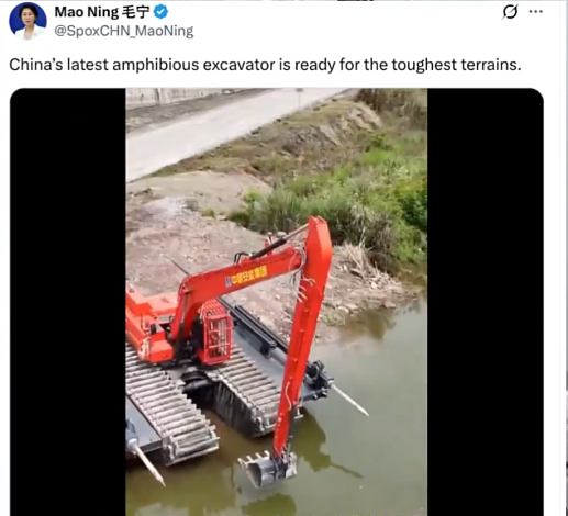 快科技12月11日消息,据媒体报道,外交部发言人毛宁近日在海外社交平台展示了中国最新研发的两栖挖掘机,并配文称其“已准备好应对最恶劣地形”。