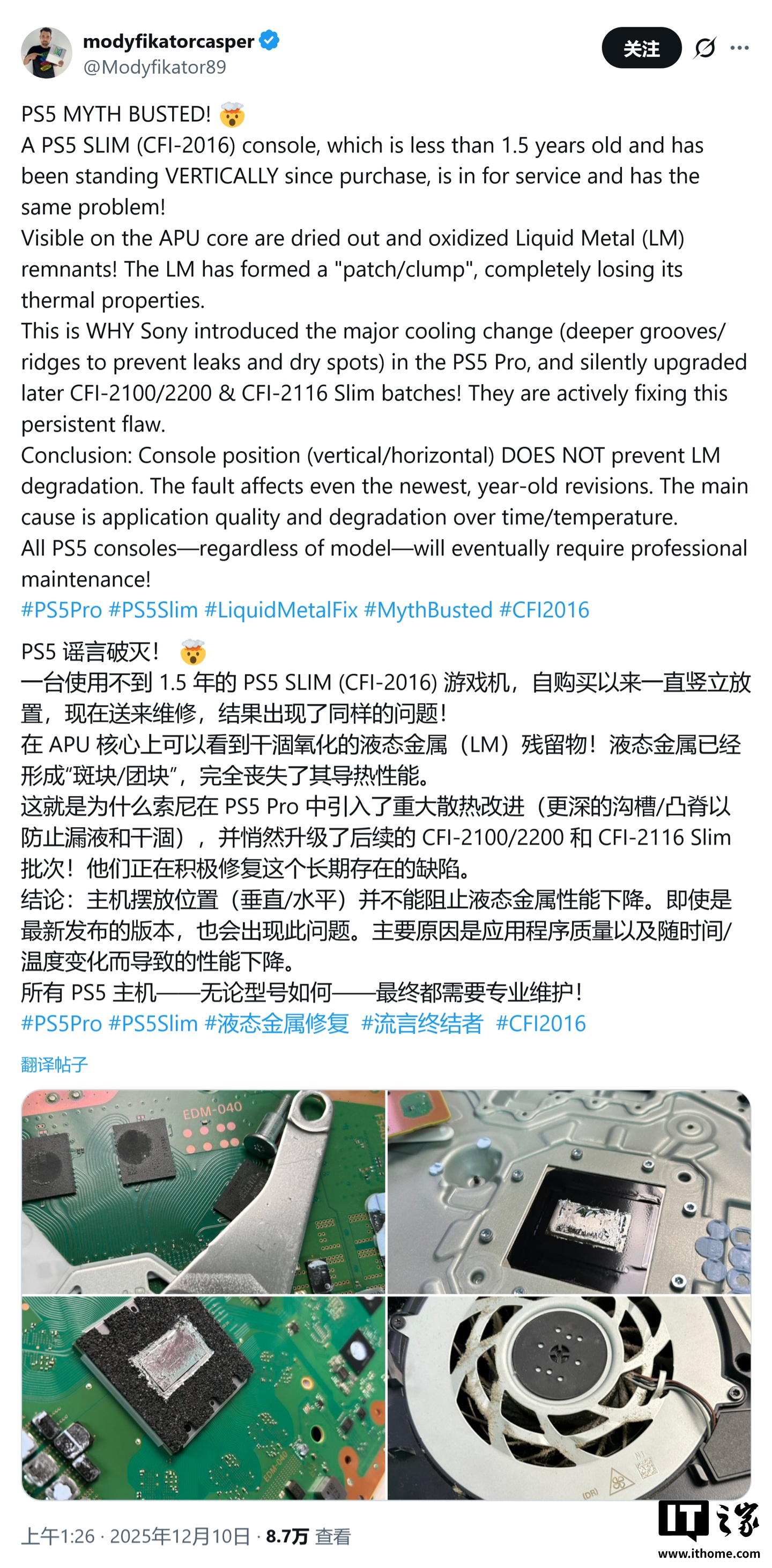 IT之家 12 月 11 日消息,维修技师 modyfikatorcasper 昨日(12 月 10 日)在 X 平台发布推文,警告称由于液态金属的涂抹质量以及随时间推移产生的物理降解,所有 PlayStation 5 游戏主机最终都将无法避免地需要开机维护。