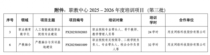 近日,教育部职业教育发展中心公布《教育部职业教育发展中心2025-2026年度培训项目(第三批)》。由用友网络承办的人工智能赋能职业院校专业建设和产教融合与实训基地建设两个项目成功入选。