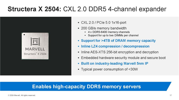 当然,如果对性能有追求,Marvell也是有DDR5扩展卡的,型号为Structera X 2504,支持4通道DDR5-6400,而且带宽翻倍到了200GB/s。