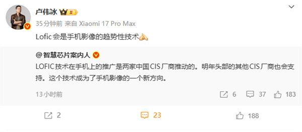 快科技12月11日消息,今日,小米集团总裁卢伟冰在转发LOFIC技术相关微博时表示:“LOFIC会是手机影像的趋势性技术。”