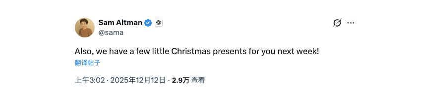 公司CEOAltman在12月11日宣布,下周会给用户们带来一些“小小的圣诞礼物”。他表示,Gemini 3对公司各项指标的影响比原本担心得要小。他还说,预计OpenAI将在2026年1月“以非常强劲的姿态”退出目前的红色警报状态