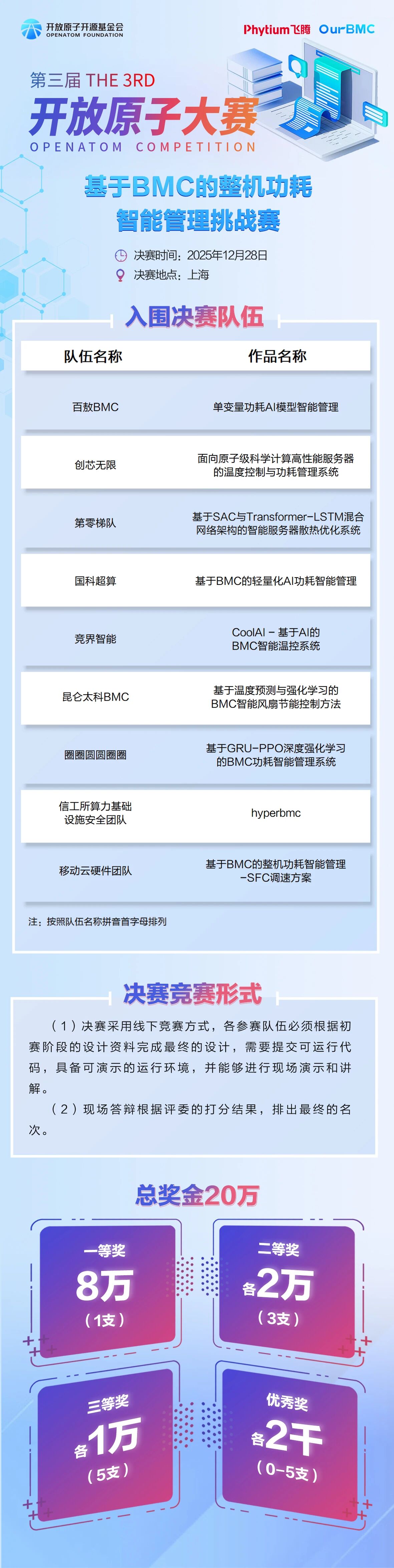 谨向所有参赛团队致以诚挚感谢,并向晋级队伍表示热烈祝贺。期待大家在决赛中全力以赴,展现卓越的技术能力与开源协作精神,共同推动 BMC 技术向智能化、高效化迈进!