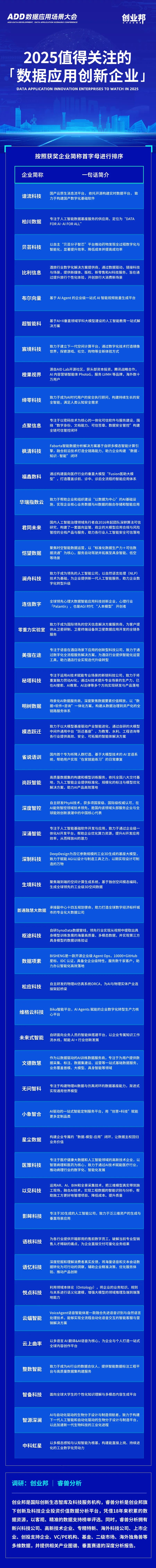 本次评选历经问卷征集、调研与评审等环节,综合考察参评企业在技术创新性、商业价值、成长潜力及创始团队等维度的表现, 最终评选出50家“2025值得关注的数据应用创新企业” 。本次评选既是对积极推动数据技术研发与真实场景应用的优秀企业的嘉奖,也为产业发展提供了风向参照与生态链接。