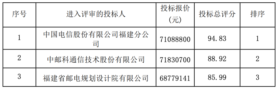 近日, 福建省数字政务建设运营控股有限公司发布国家数据基础设施(福建)区域功能节点项目(软件部分)中标候选人公示,中国电信股份有限公司福建分公司以71088800元报价、94.83分的高分位列第一,而其余两家中标候选人也均与电信体系存在深度 关联。