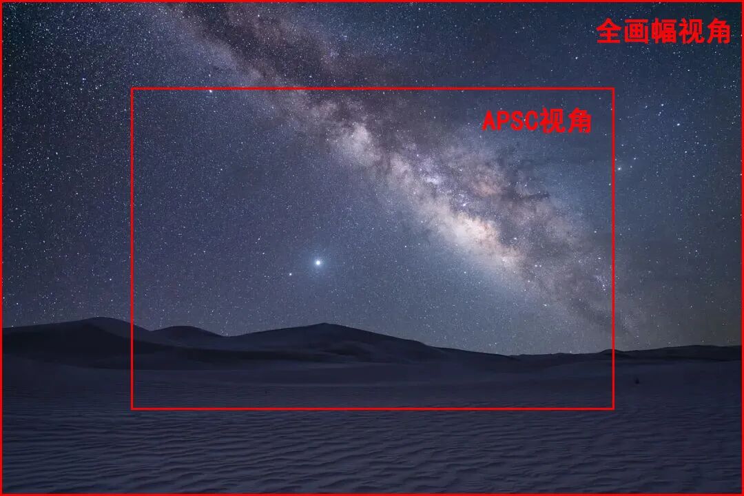 (上全、下 APSC)为啥用这两个场景举例子呢,因为普通的场景视角不一致,往前走几步或往后退几步就能解决,但星空、月亮就没法这么做了,总不会在 3 楼看的月亮比 1 楼大很多很多吧。