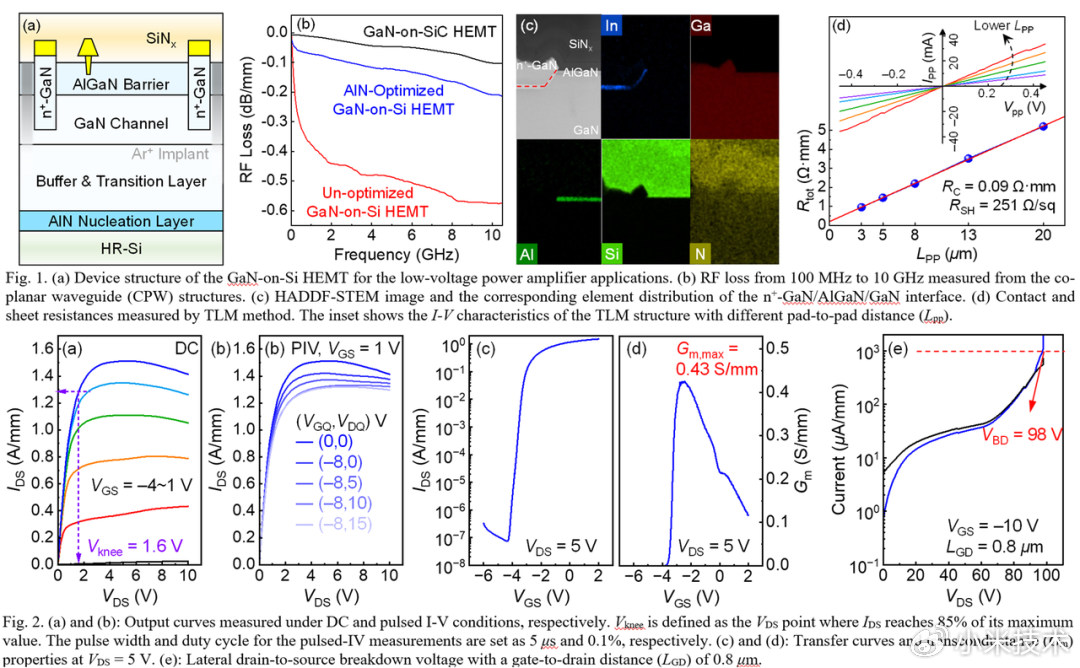 为攻克这一难题,研究团队聚焦于硅基氮化镓(GaN-on-Si)技术路线,通过电路设计与半导体工艺的协同创新,成功开发出面向手机低压应用场景的射频氮化镓高迁移率电子晶体管(GaN HEMT)技术,并率先在手机平台上完成了系统级性能验证,为 6G 时代终端射频架构的演进奠定了关键技术基础。