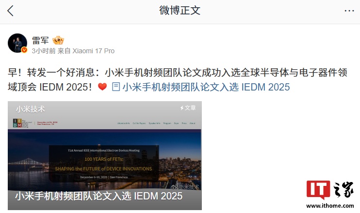 IT之家 12 月 14 日消息,小米创办人、董事长兼 CEO 雷军今日转发了一则消息:小米手机射频团队论文成功入选全球半导体与电子器件领域顶会 IEDM 2025。小米技术官方表示,此次入选标志着氮化镓高电子迁移率晶体管技术在移动终端通信领域实现历史性突破,并获得国际顶尖学术平台的高度认可。