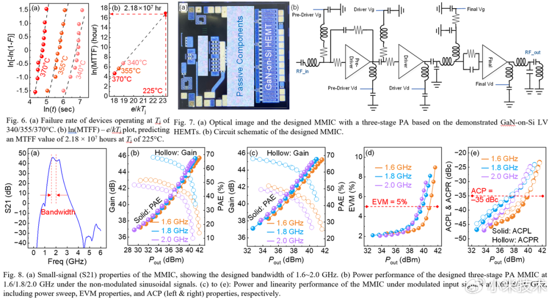相较于传统的 GaAs 基功率放大器,在保持相当线度性的同时,研究团队开发的低压氮化镓功放展现出显著的性能优势。最终,该器件实现了比上一代更高的功率附加效率(PAE),并同时兼顾通信系统的线性度和功率等级要求,在系统级指标上达成重要突破。