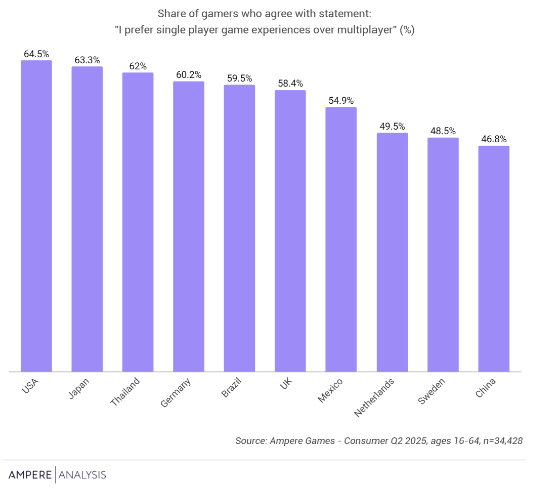 不同市场也存在显著差异。美国偏好单人游戏的玩家比例最高,达到65%。与此同时,中国玩家对单人游戏体验的兴趣最低,只有47%的16至64岁玩家表示更喜欢这种游戏风格。荷兰(50%)和瑞典(49%)的”单人游戏优先”玩家比例也低于平均水平。