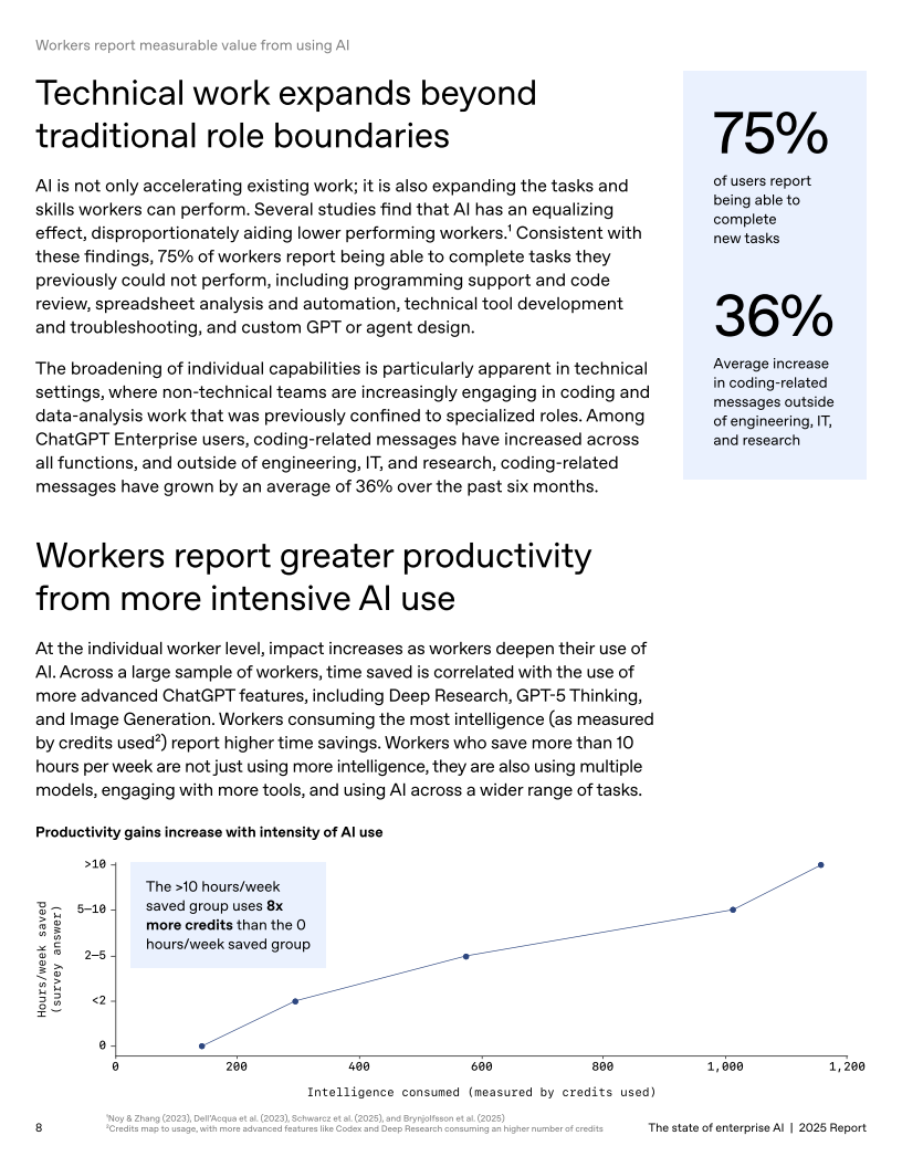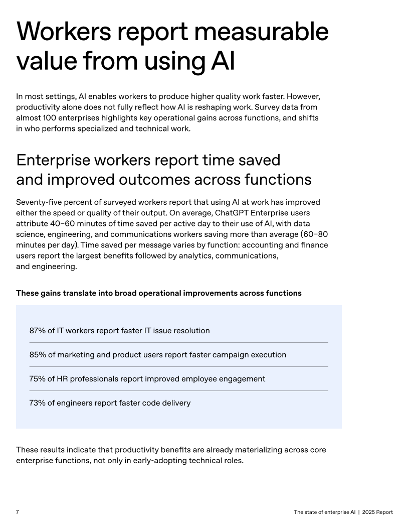 员工层面,75%的受访者认为AI提升了产出速度或质量,活跃用户日均节省40–60分钟;数据科学、工程和传播类工种平均节省60–80分钟,节省时长与使用更高级功能呈正相关。