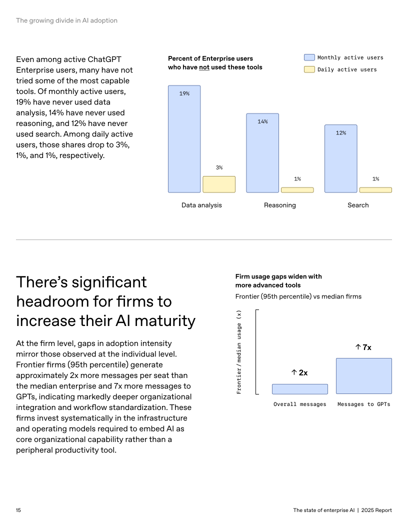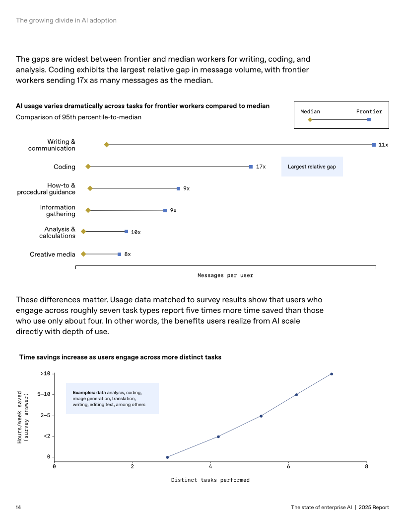 采纳深度出现分化:前沿员工消息量为中位数的6倍、前沿企业每座席消息数约为中位的2倍,向GPT的调用在前沿企业高出7倍;编码类任务的前沿/中位差距高达17倍,表明“深度使用”带来更大回报。