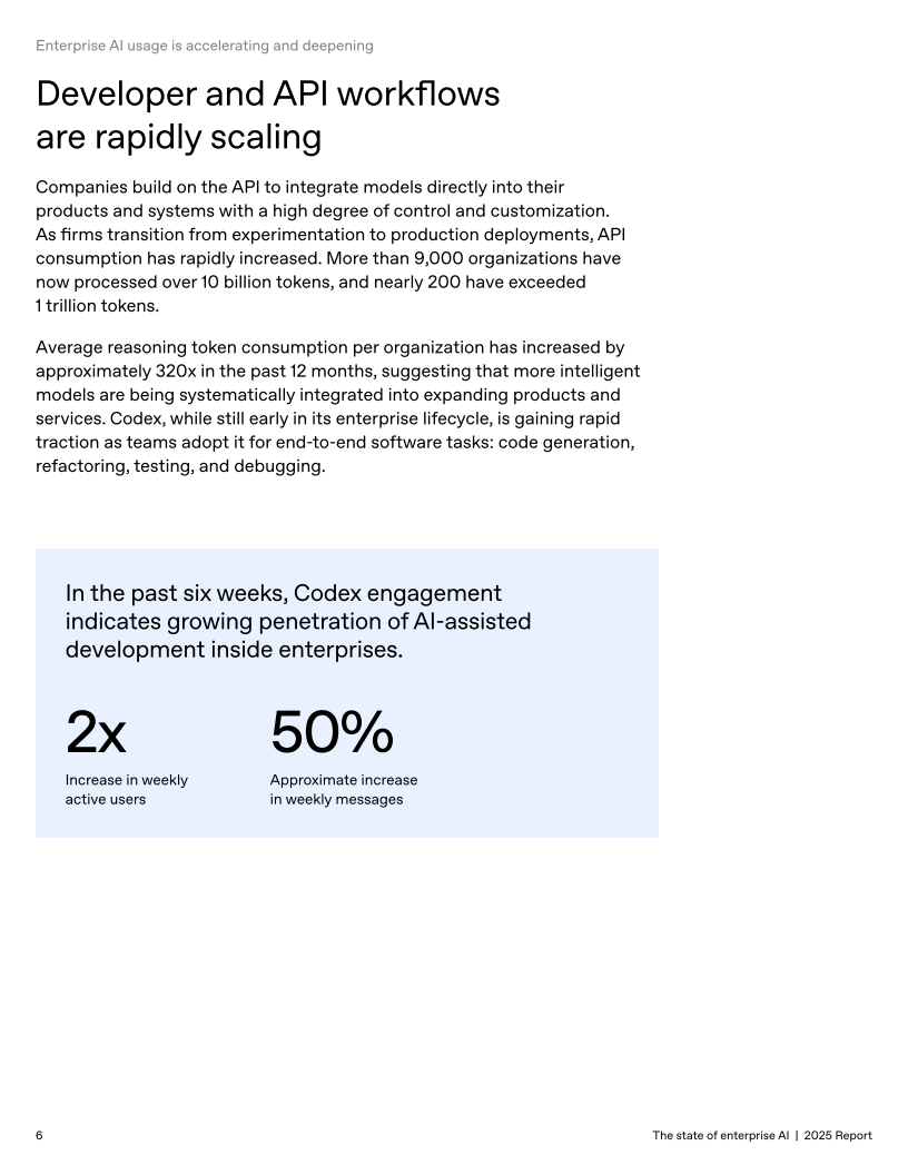 在开发端,已有9,000多家机构处理超过100亿令牌,近200家超过1万亿令牌;Codex在企业中渗透加速,最近六周周活用户与消息量均显著上升。