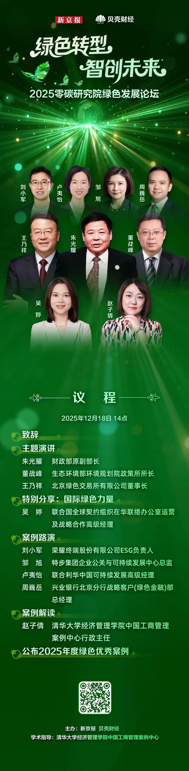 在全面贯彻“十五五”规划建议宏伟蓝图、深入推动发展方式绿色转型的关键节点,新京报零碳研究院将于12月18日在北京举办2025年度绿色发展论坛,并以“绿色转型,智创未来”为主题,汇聚政、产、学、研各方智慧,深入探讨新型能源体系建设、碳市场机制优化、产业低碳转型等核心议题,分享前沿实践与创新成果,为构建人与自然和谐共生的现代化贡献智慧与方案。