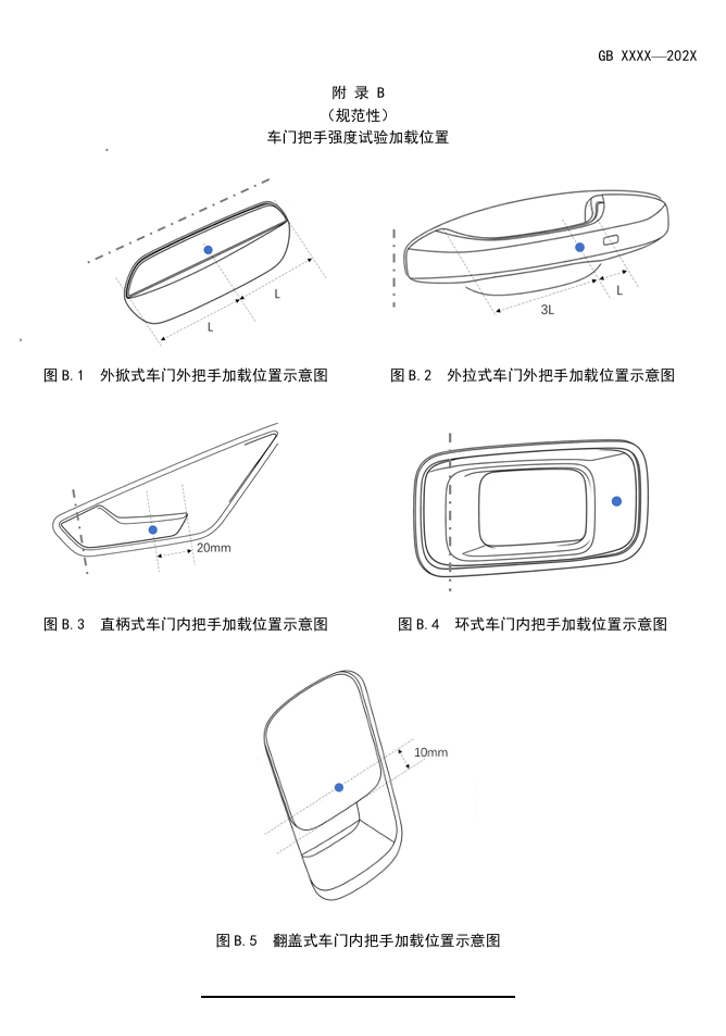 对于外掀式车门外把手,加载装置中心位置位于宽度方向的中点,见图 B.1;