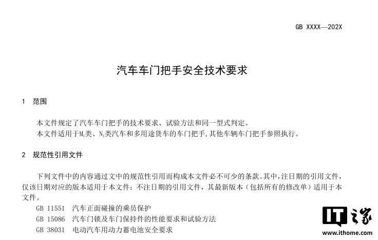 IT之家 12 月 16 日消息,根据国家标准委下达的强制性国家标准制修订计划,工业和信息化部组织完成了《汽车车门把手安全技术要求》等 7 项强制性国家标准(报批稿)、《电动汽车安全要求》强制性国家标准外文版(报批稿)的编制工作。
