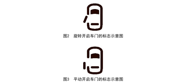 a) 根据车门开启方式,标志的图形如图 2 或图 3 所示,准许图形镜像表示,图形尺寸至少为 10mm×7mm,可对图形线条的粗细、间隙、图形的比例、弧线弧度、导角等进行调整,但不改变标