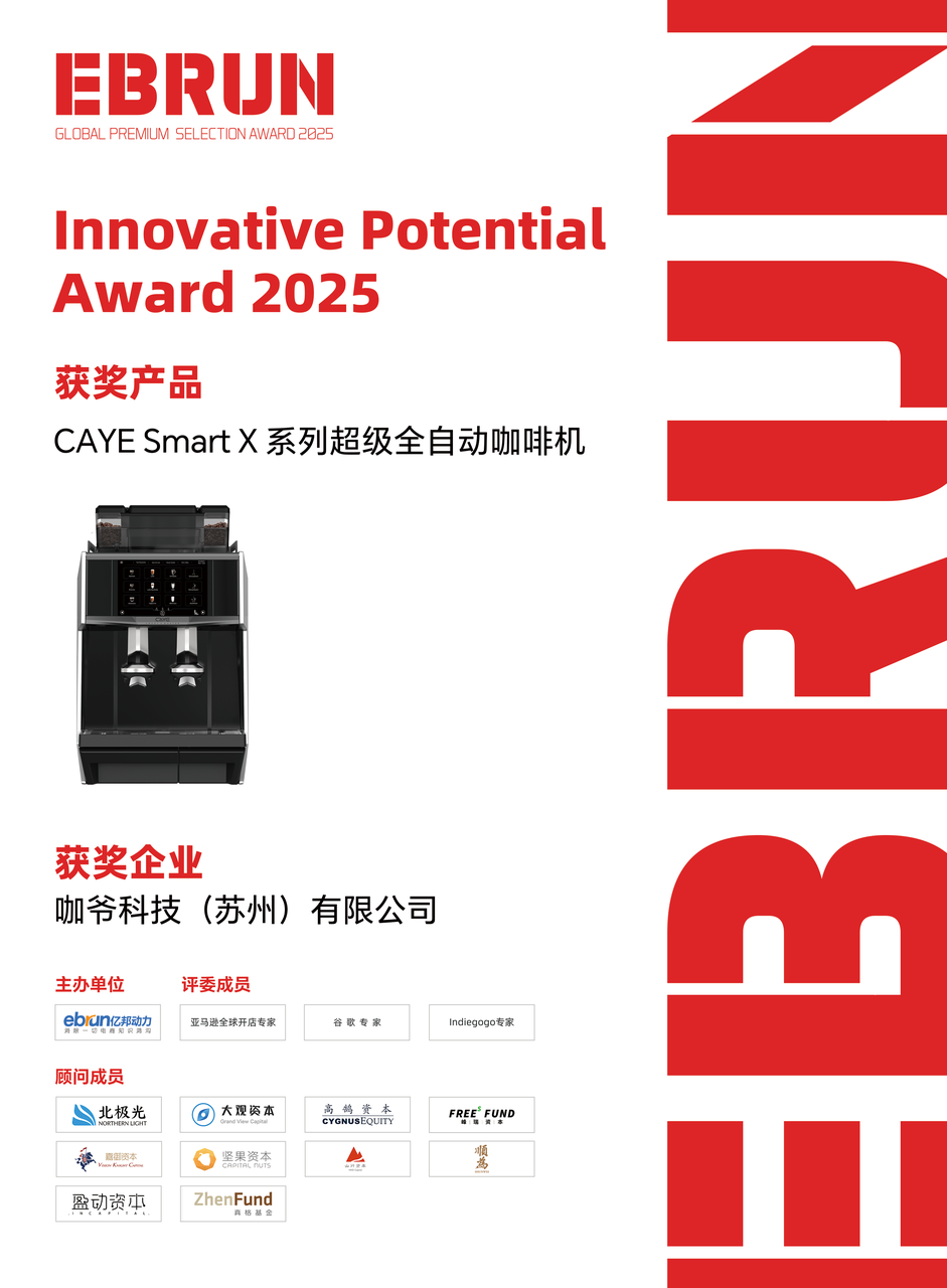 在激烈的角逐中,全球高端商用咖啡设备领域的创新先行者CAYE(咖爷科技(苏州)有限公司) 凭借其对全自动咖啡机底层技术的颠覆性重构脱颖而出。其旗舰产品系列 “CAYE Smart X系列超级全自动咖啡机” 经过层层评审,成功斩获2025届重要奖项——EBRUN全球好物Innovative Potential Award 2025。