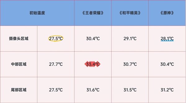 游戏前机身初始温度均匀,摄像头、中部、尾部区域均在27.5℃-27.7℃之间。两局《王者荣耀》后,各区域温度仅升至28.1℃-30.4℃;一局《和平精英》后,最高温度出现在摄像头区域,为33.4℃。即便是高负载的30分钟《原神》,全机身温度也稳定在31.2℃-31.6℃,整体温差控制在6℃以内,长时间握持无明显烫手感。