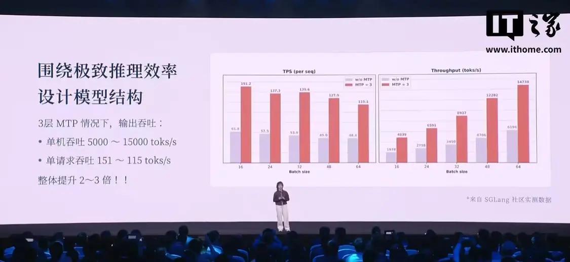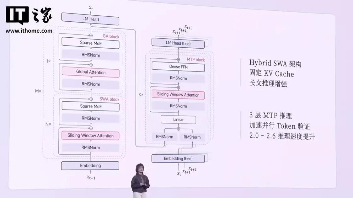 罗福莉解释称,MiMo-V2-Flash 围绕极致推理效率设计了模型结构,通过 3 层 MTP 推理加速并行 Token 验证,实现了 2.0~2.6 倍的推理速度提升。