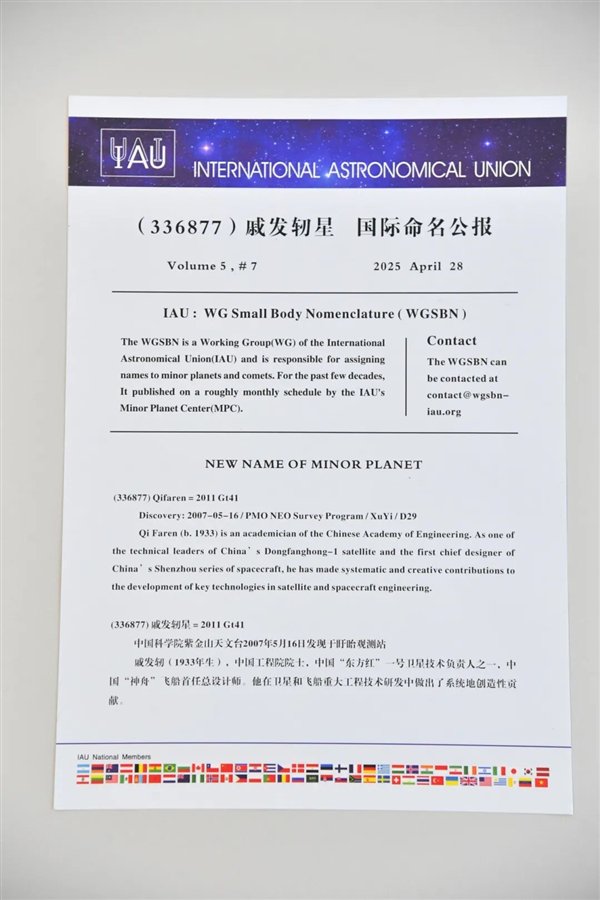 快科技12月17日消息,中国空间技术研究院宣布,经天文学联合会批准,一颗小行星今天被正式命名为“戚发轫星”。