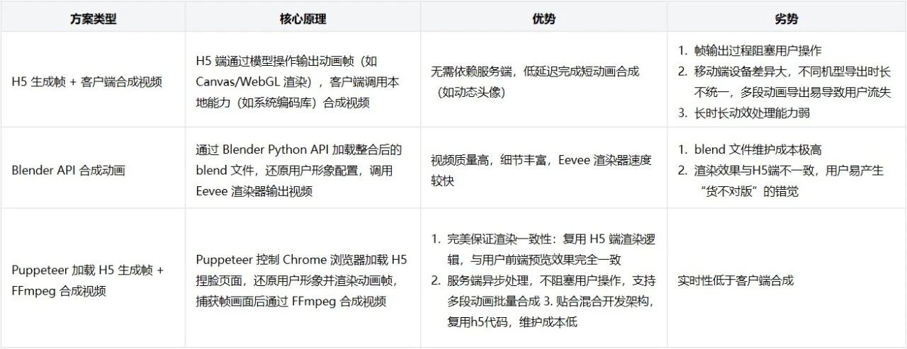 为解决拟我形象在多场景展示中依赖 3D 渲染导致的性能与接入问题,本文提出将形象预先导出为视频或动图资源。对比三种技术路径后,最终选择 Puppeteer + H5 渲染帧 + FFmpeg 合成视频 的方案,实现了渲染效果一致、服务端批量处理和低接入成本,为拟我形象的规模化应用提供了高效可扩展的技术基础。