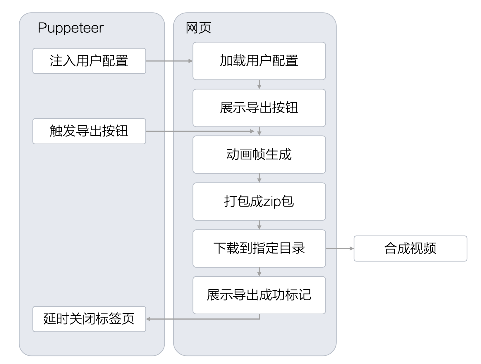在页面唤醒时,Puppeteer 会将所需的用户数据与导出的动画名称注入到 window 对象中。网页在读取并加载对应配置后,会展示一个“导出视频”的按钮。理论上在配置加载完成后即可直接开始帧生成,但为了方便本地开发与调试,我们仍保留了手动触发导出的按钮。