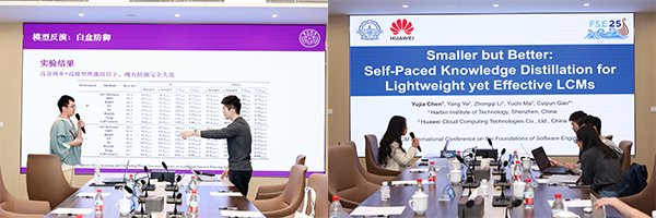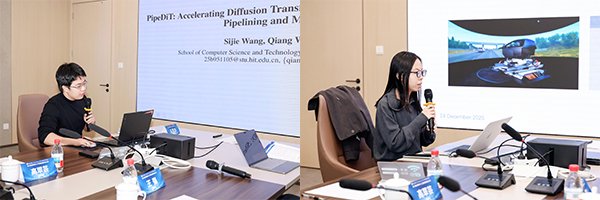 在AI国际顶级会议论文分享环节,邀请了来自多所院校的5位讲者进行了顶会论文分享汇报,现场讨论氛围热烈:清华大学深圳国际研究生院余泓垚分享CCF A类会议ACM MM 2025论文《ICAS: Detecting Training Data from Autoregressive Image Generative Models》,香港浸会大学杨星星分享CCF A类会议NeurIPS2025论文《Exploring Metameric Dilemma for Hyperspectral Image Reconstruction》,哈尔滨工业大学(深圳)王思杰分享CCF A类会议AAAI 2026论文《PipeDiT: Accelerating Diffusion Transformers in Video Generation with Task Pipelining and Model Decoupling》,香港中文大学李树青分享CCF A类会议ICSE 2026论文《3D Software Synthesis Driven by Constraint-Expressive Intermediate Representation》,哈尔滨工业大学(深圳)陈雨佳分享CCF A类会议 FSE 2025论文《Smaller but Better: Self-Paced Knowledge Distillation for Lightweight yet Effective LCMs》。