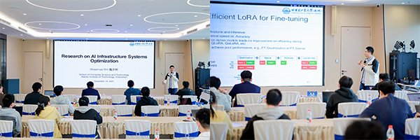 国家级青年人才、哈尔滨工业大学(深圳)施少怀教授作了题为《大模型基础设施系统优化研究》的报告分享。他介绍了深度学习模型的基础架构,着重谈到了大模型训练与推理的应用背景及研究进展,分享了分布式训练的混合并行策略,并提出通过调度优化提升大模型数据并行和专家并行的训练效率。此外,他还讨论了大模型微调中内存高效的矩阵冻结技术,以及中低端图形处理器上混合专家模型推理的软硬件协同方案,最后还介绍了自研HAIOS算力管理系统的架构设计与应用成效。