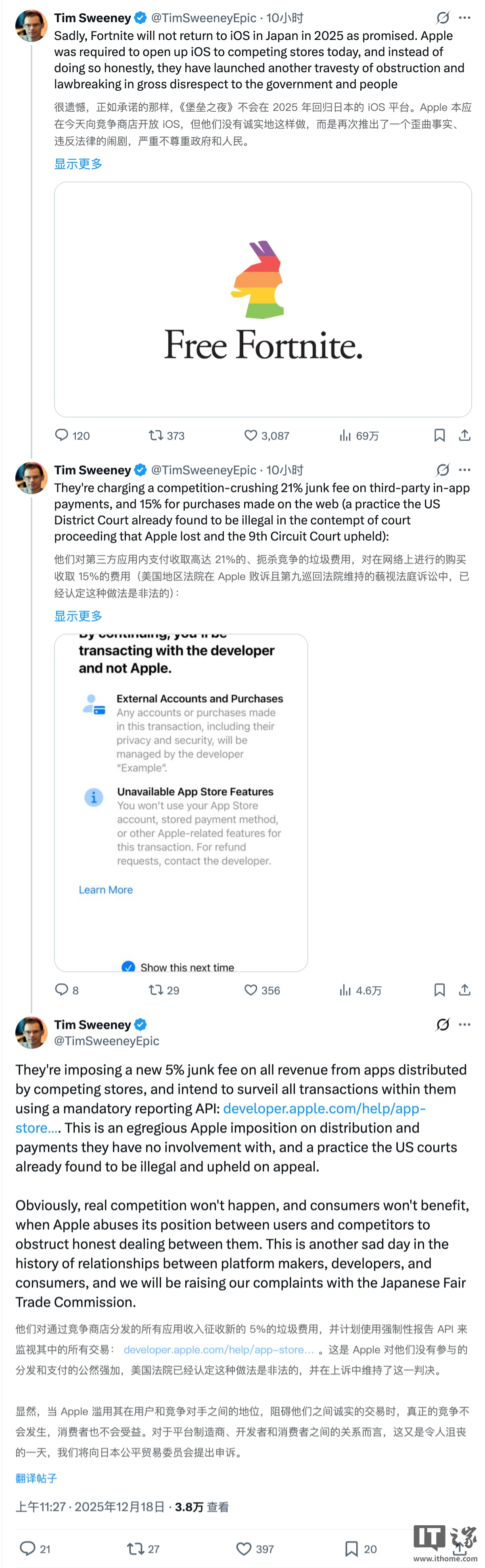 IT之家 12 月 18 日消息,苹果宣布为日本 iPhone 开放第三方应用商店和支付体系后,Epic Games CEO 蒂姆・斯威尼迅速公开表达不满,直指苹果设置的“垃圾费用”将直接阻止《堡垒之夜》回归 iOS 平台