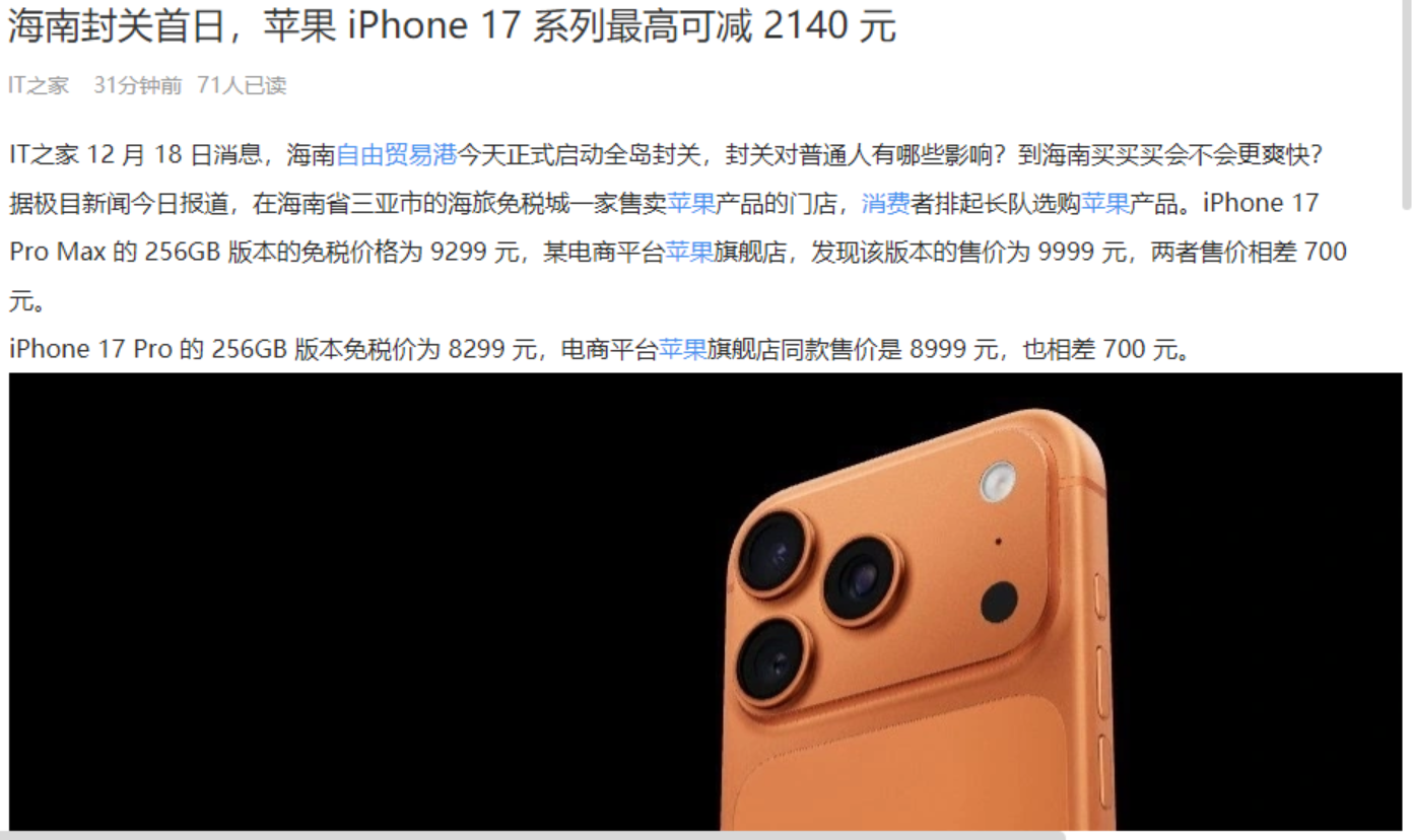 以售价最贵的 iPhone 17 Pro Max 的 2TB 版本为例,其免税价格为 16859 元,叠加满 15000 元减 1000 元消费券,最终售价为 15859 元,比官网售价便宜了 2140 元。