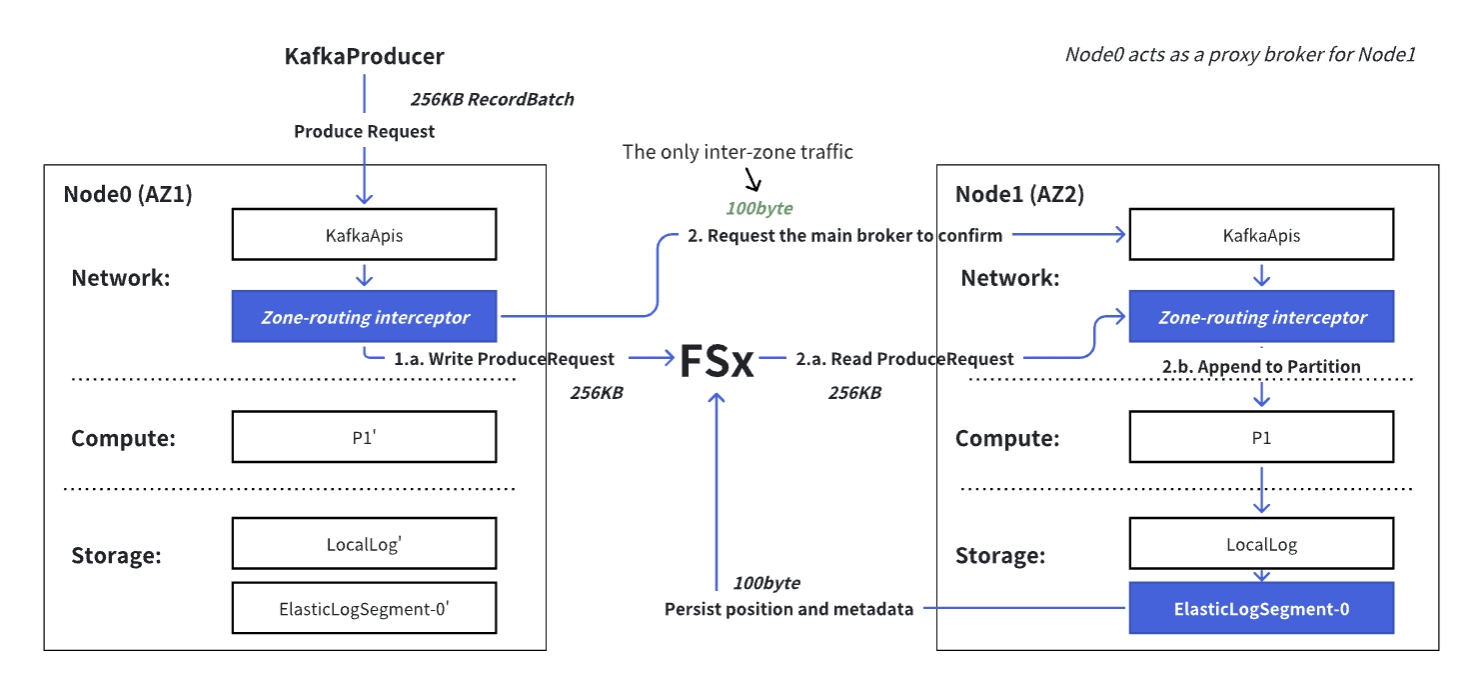 Because FSx is regionally shared and accessible from all AZs via NFS, no actual record data crosses AZ boundaries; only a minimal control message does. This reduces inter-zone traffic by 3–4 orders of magnitude compared to Apache Kafka.