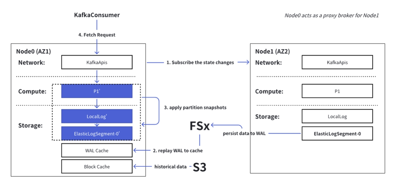 - Finally, the proxy broker can directly return the latest written data from the WAL cache to the consumer, while historical data is read from S3 on demand and returned to the consumer.