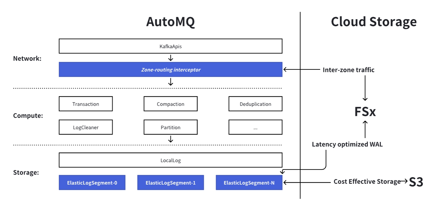 - Zero Inter-Zone Traffic: AutoMQ has added a zone-routing interceptor beneath KafkaApis to intercept Produce and Metadata requests. This allows clients to only communicate with brokers in the same zone, thereby achieving zero inter-zone traffic for Kafka clients.