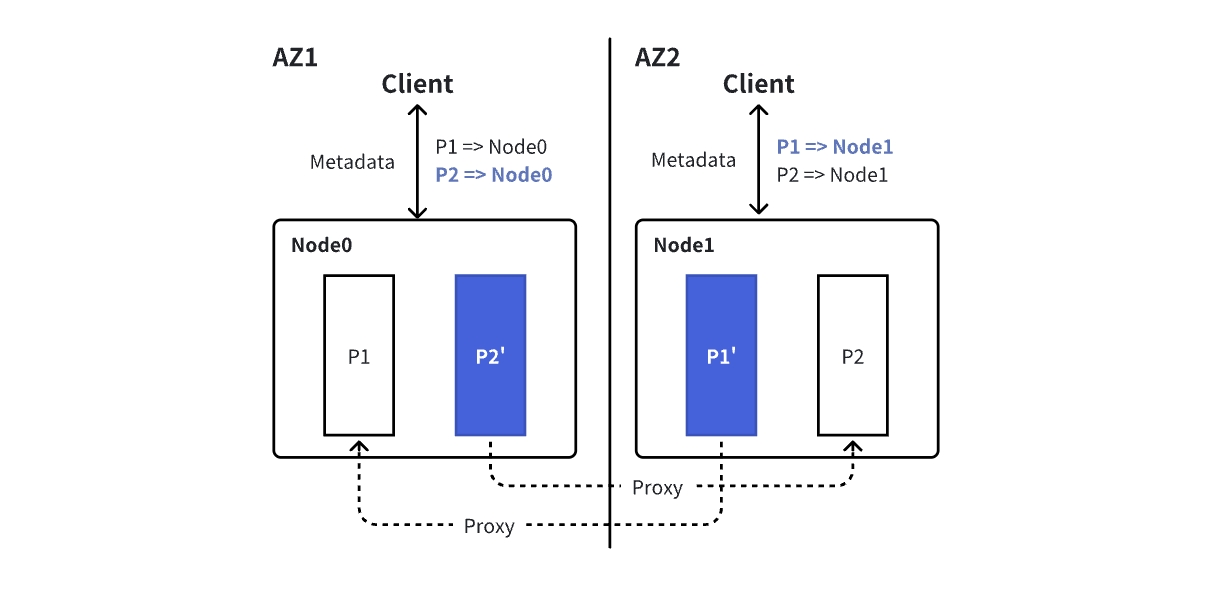 Take the following diagram as an example: Node0 and Node1 are proxy brokers for each other, where the partition leaders of P1 and P2 are on Node0 and Node1, respectively. The response returned by the client metadata request in AZ2 will be modified to {P1 => Node1, P2 => Node1}.