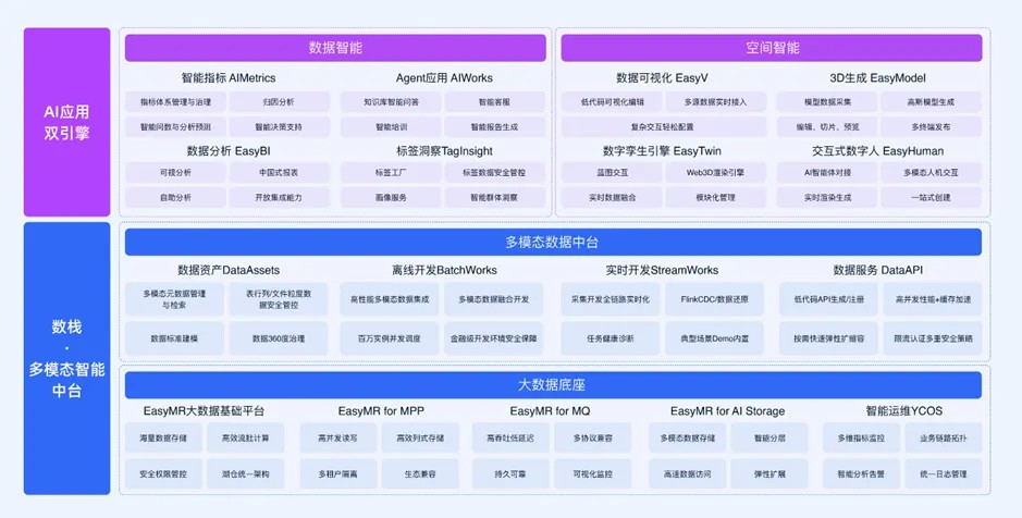 - 从产品结构看,它由 多模态数据中台 + 大数据底座平台 构成,前者解决 “ 管什么、怎么管 ” ,后者解决 “ 放在哪里、怎么算 ” ;