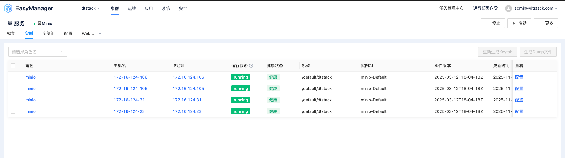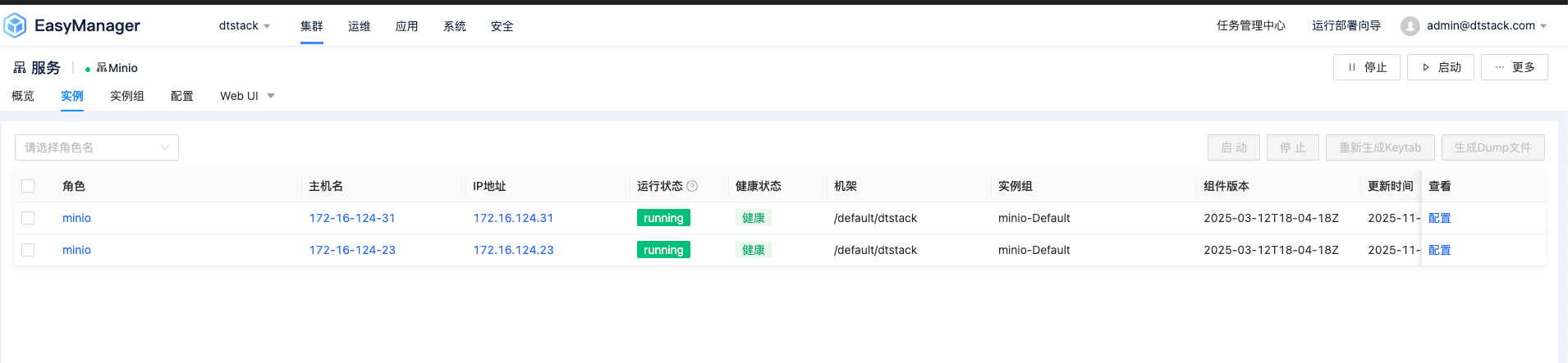 定位 Minio 服务:在服务列表中,找到 “Minio” 或 “对象存储” 服务。您可以通过服务状态指示灯确认其当前运行正常。
