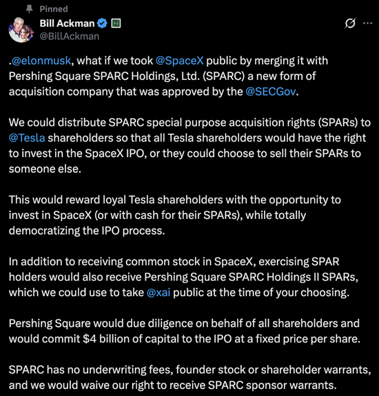 Ackman抛出SpaceX上市新方案:不走传统IPO,没有承销费,特斯拉股东可先上车