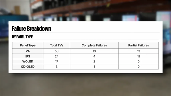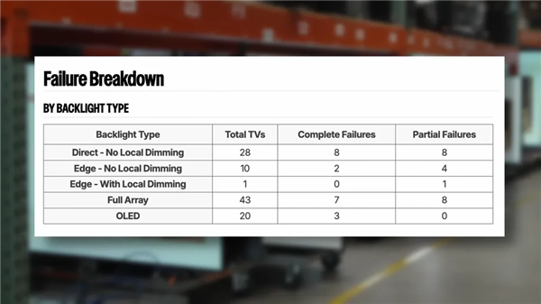 而具备全阵列局部调光(FALD)的Mini-LED电视表现更好,故障率降至25%左右。