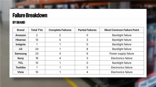在品牌表现方面,LG和TCL脱颖而出,LG的24台电视中,仅有一台OLED电视彻底故障;而在10款TCL电视中,仅有一台在测试结束前“倒下”,不过LG也出现了几起部分故障,但大多发生在LCD电视上,而非OLED。