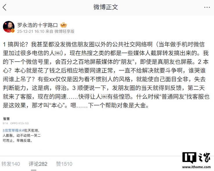 IT之家 12 月 21 日消息,罗永浩 12 月 18 日在朋友圈吐槽上海电信网速问题。罗永浩表示,其搬至上海后开通电信独享千兆宽带服务,然而这半年多时间里,宽带实际速率绝大多数时候仅有不到一百兆。