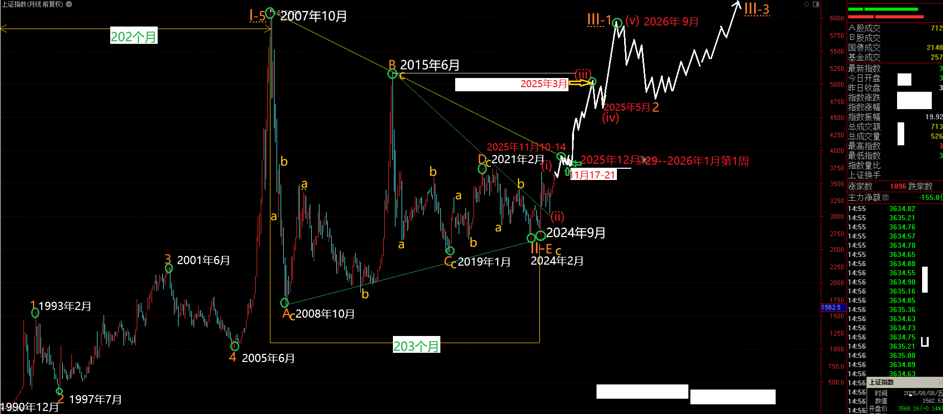简言之,12月29–2026年1月第1交易周后,大盘将进入今年4月8以来更大的、更持久的、更强的主升势大行情(大牛市,2007年10月份以后最大的牛市),直至2026年9月份,只是在2026年3月会有一个阶段高点,调整一两个月后再向9月份进发。