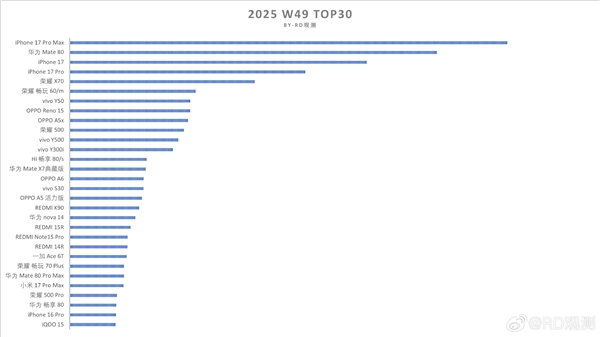 此外,博主“@智慧芯片案内人”还发布了第49周的机型销量排名,其中iPhone 17 Pro Max凭借出色的市场表现,成功登顶当周销量冠军。