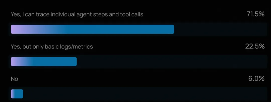 • 在已上线智能体的团队中,这一比例更高,94% 拥有某种可观测性,71.5% 具备完整追踪能力。这揭示了一个基本事实:若无法看清智能体如何推理和行动,团队就无法可靠地调试故障、优化性能,也无法赢得内外部利益相关者的信任。