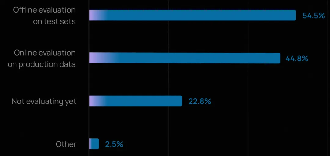 • 大多数团队仍从离线评估入手(因其门槛较低、设置更清晰),但许多正在叠加多种方法。在开展评估的组织中,近四分之一同时使用离线和在线评估。