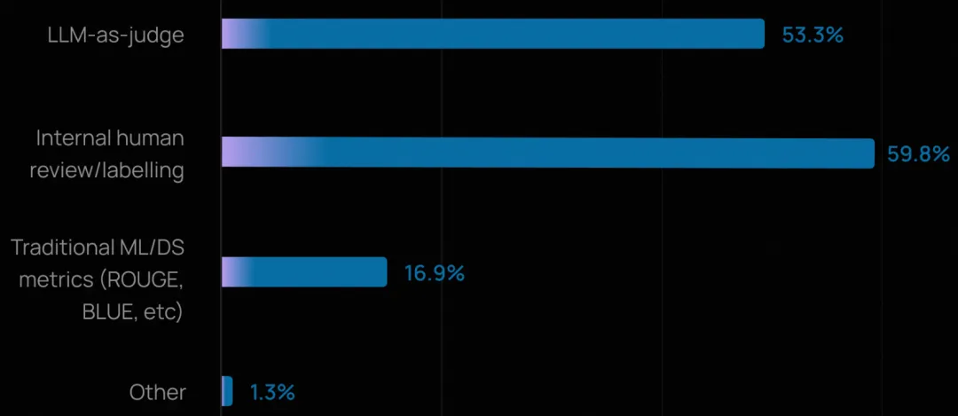 • 总体而言,人工评审(59.8%)在高风险或需细腻判断的场景中仍不可或缺,而 LLM-as-Judge(53.3%)则被越来越多地用于规模化评估质量、事实准确性和合规性。