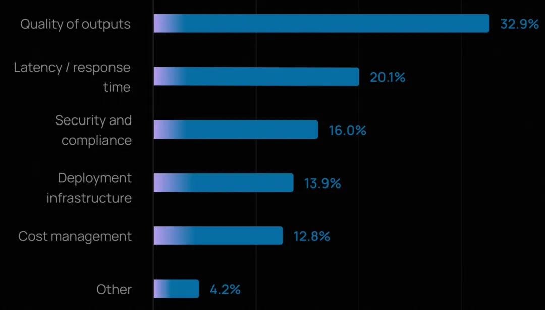 • 质量仍是头号难题,与去年一致。 今年有三分之一的受访者将其列为最大障碍。这里的”质量”涵盖准确性、相关性、一致性,以及智能体能否保持恰当语气并遵守品牌或政策规范。