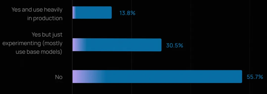 • 同时,微调仍未普及。 57% 的组织未进行任何微调,而是依赖基础模型结合提示工程和检索增强生成。由于微调需要大量投入(数据收集、标注、训练基础设施和持续维护),目前主要用于高影响力或高度专业化的场景。