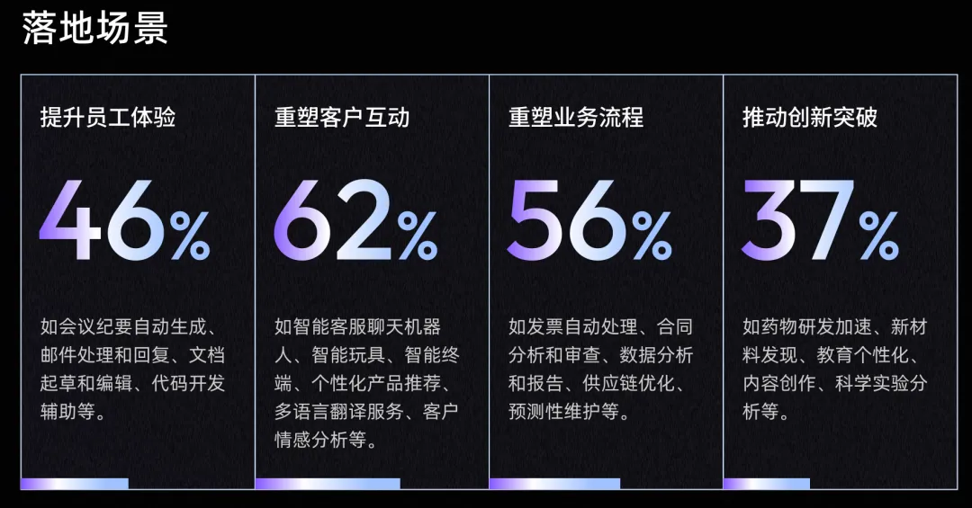 《AI 原生应用架构白皮书》提供了以下 4 类落地场景供多选,重塑客户互动 > 重塑业务流程 > 提升员工体验 > 推动创新突破。结合两份数据,客户服务和企业内提效是智能体最确定的应用场景。