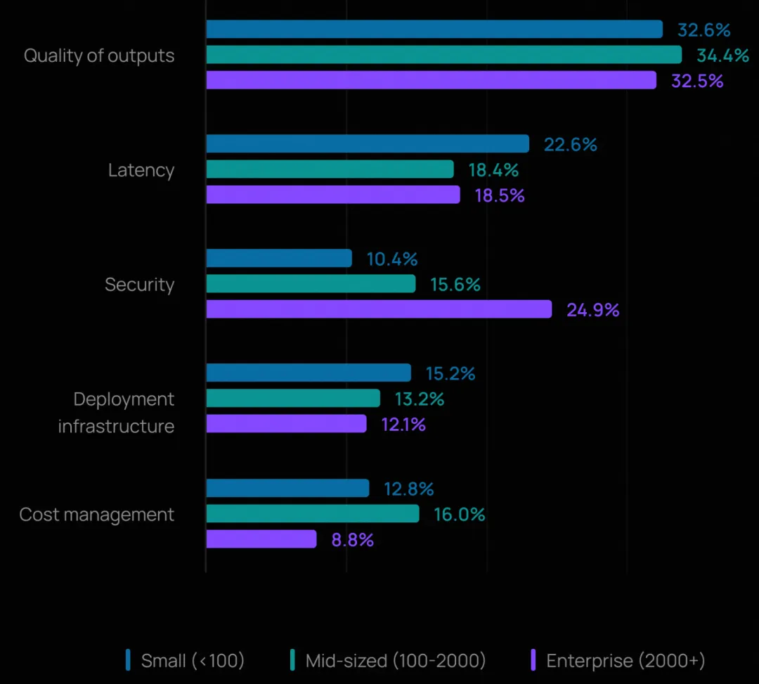 • 延迟成为第二大挑战(20%)。 随着智能体进入客户服务、代码生成等面向客户的场景,响应速度已成为用户体验的关键。这也反映了团队在质量与速度之间的权衡:能力更强、步骤更多的智能体虽能产出更高质量结果,但响应往往更慢。